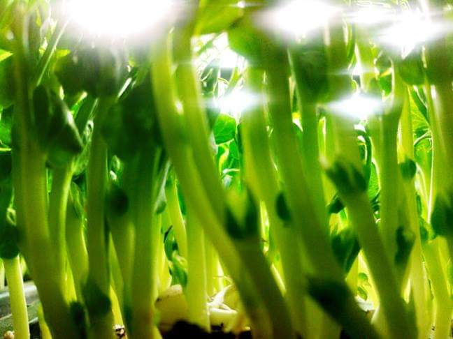 Tendril Pea Shoots in front, young Wheatgrass shoots in back before giving light exposure